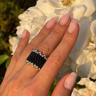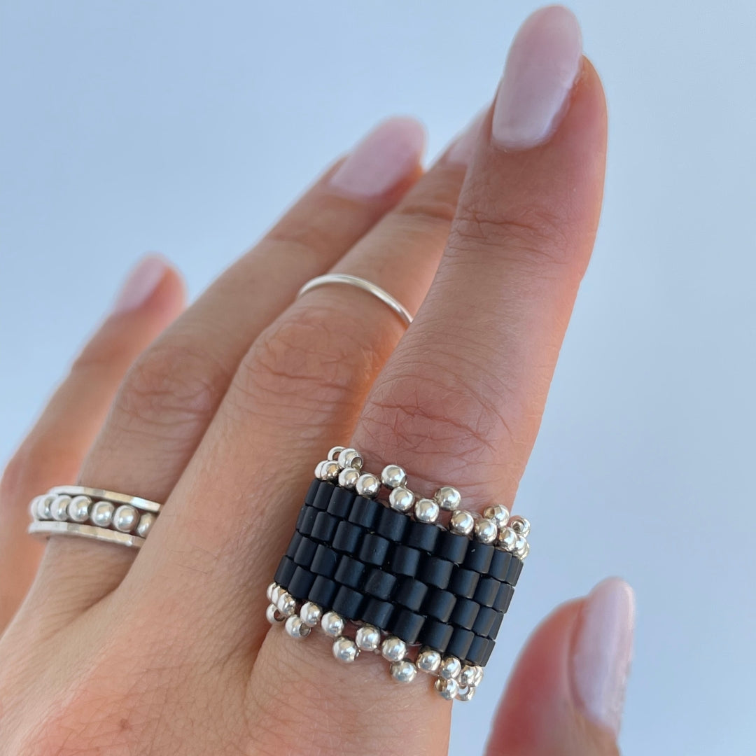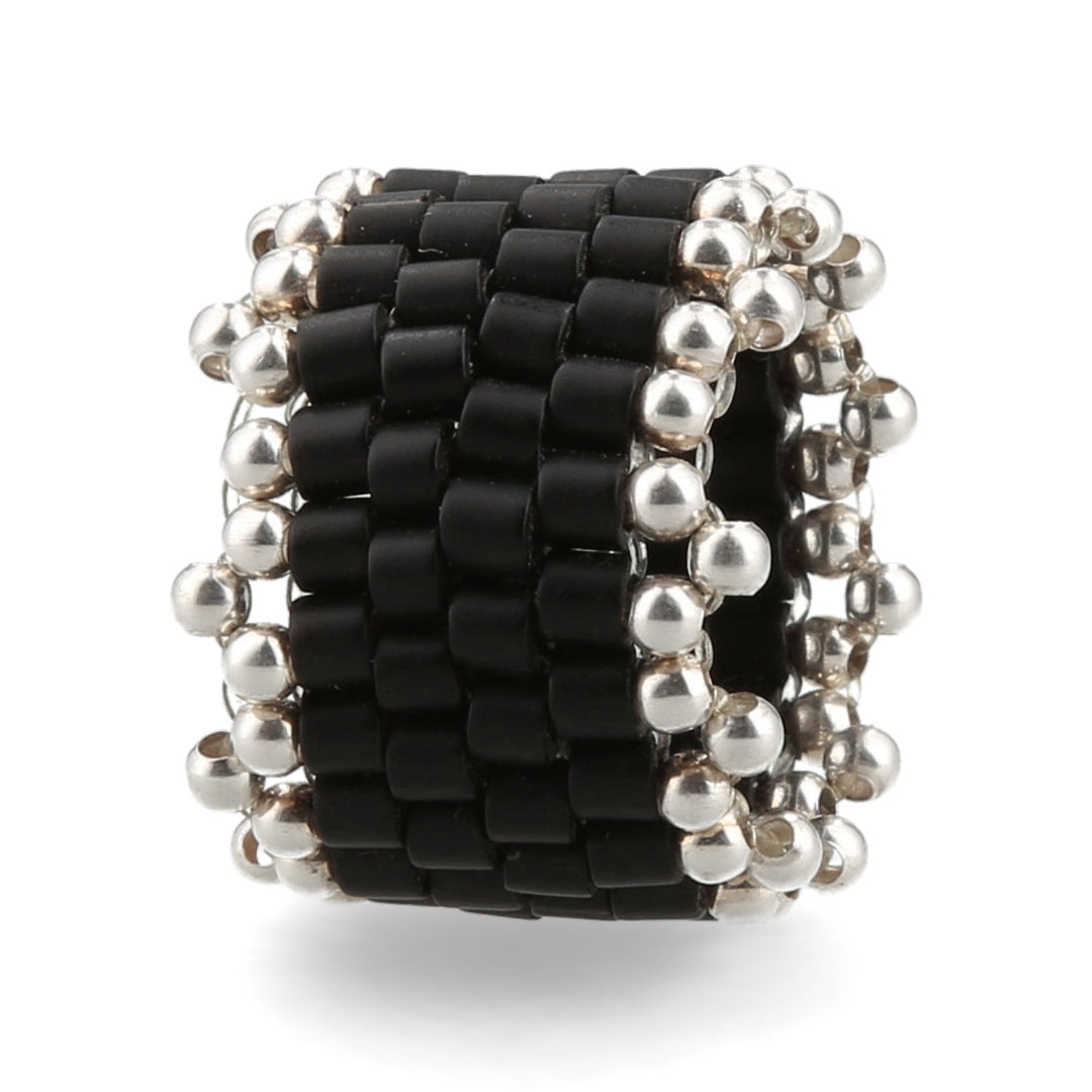 Anillo Tejido Ancho De Mostacillas Negras Grandes Con Corona Doble De Bolitas De Plata