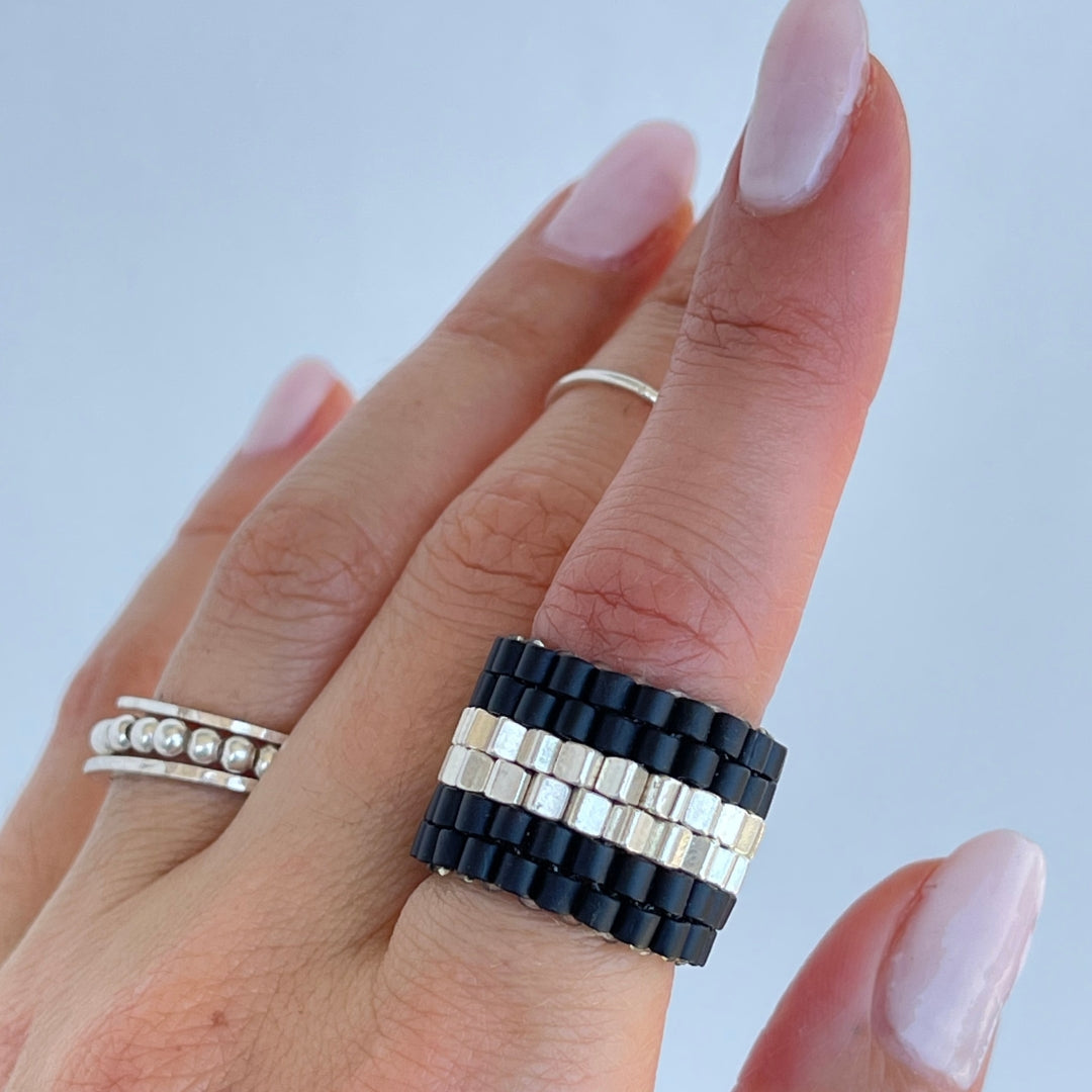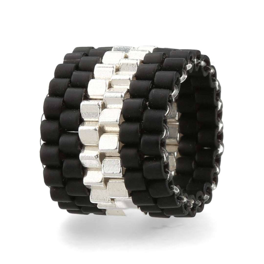 Anillo Tejido De Mostacillas Cuadradas Grandes De Plata Y Negro Ancho