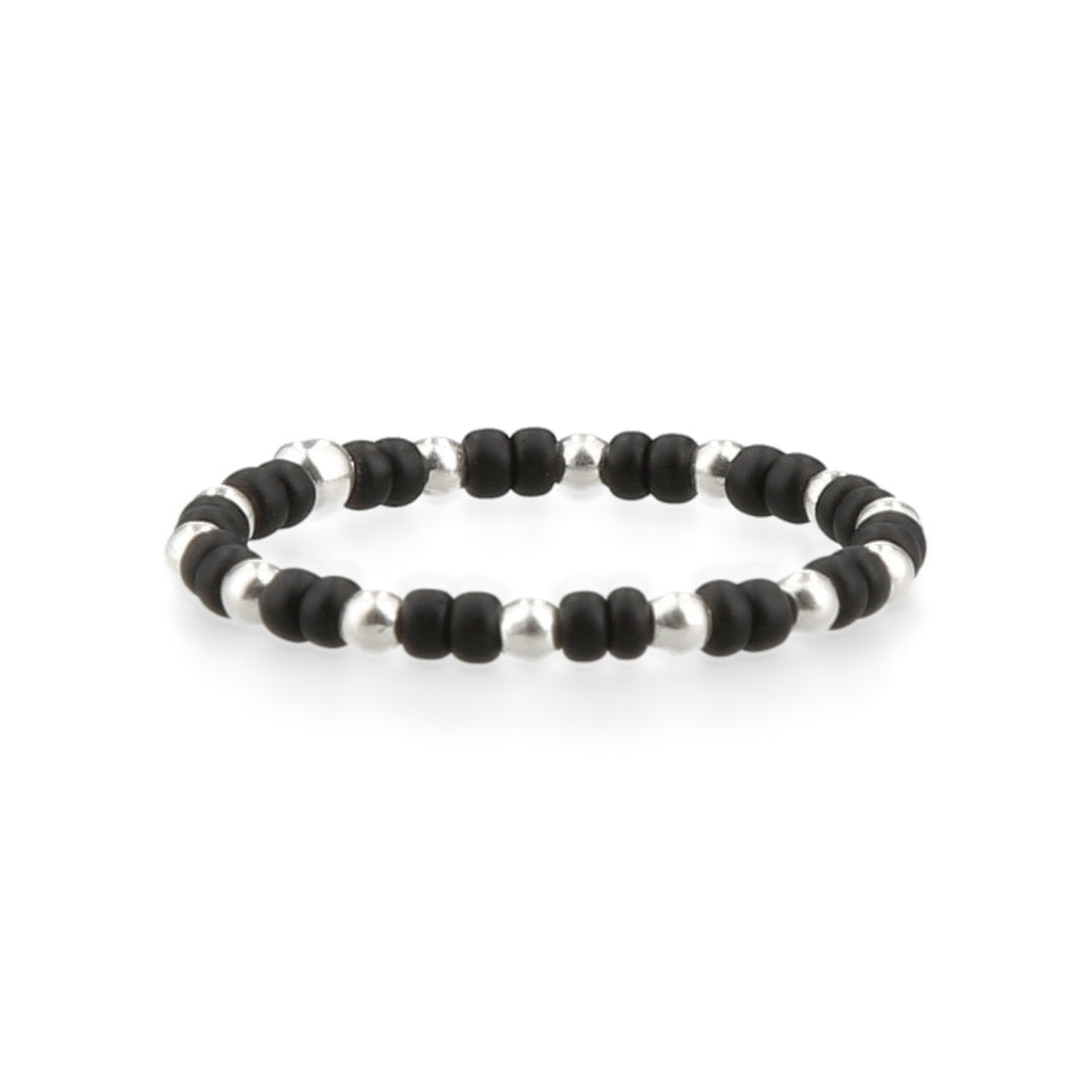 Este anillo de mostacilla en Plata 925 con acabado negro mate es perfecto para el uso diario. Está hecho con bolitas de plata y mostacillas de cristal negras de 2 mm, creando un diseño elegante y moderno.